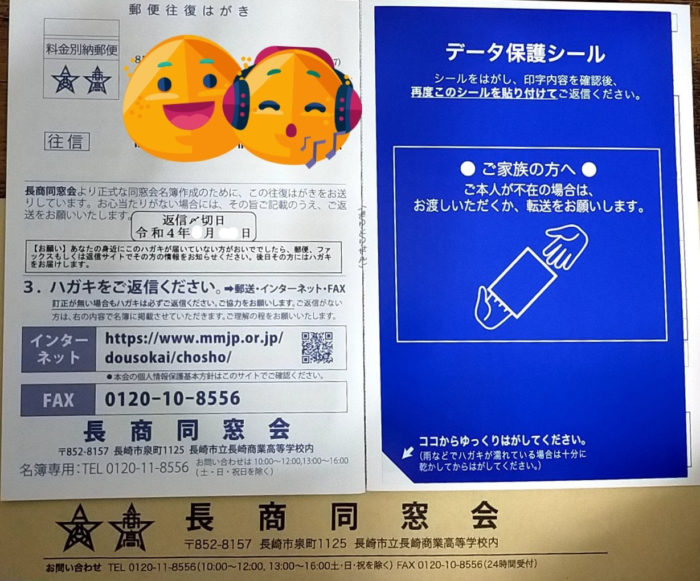 届いた方は、内容を確認して変更が有れば返信ハガキで郵送、若しくはホームページにて変更して下さい。宜しくお願いします。