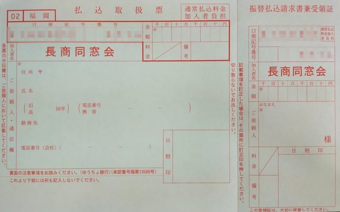 個人で納入される場合は赤色の郵便振替伝票にご記入戴きお近くの郵便局から振替下さい。