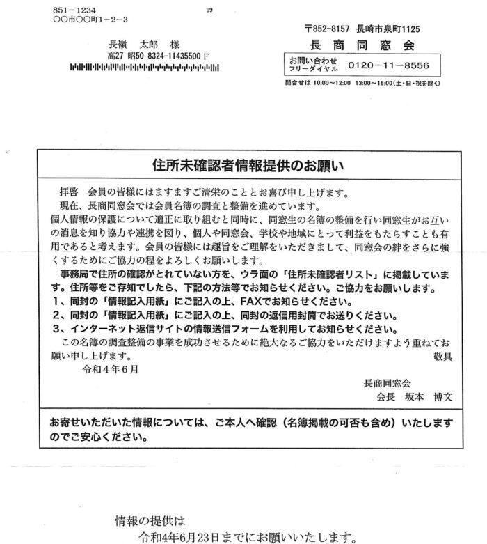 6月9日に同期の住所未確認者リストを発送いたしました。