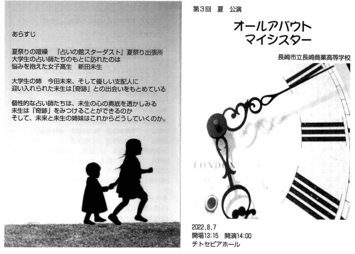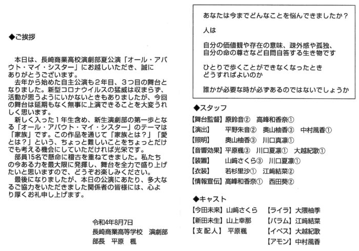 長商演劇部 第3回 夏 公演「オールアバウト マイシスター」日時2022年8月15日(チラシは変更前のデータです)開場13:15 開演14:00会場 チトセピアホール入場無料(コロナ対策の為、お名前・緊急連絡先・体調申告の記入有)応援宜しくお願いします。お誘い合わせのうえご来場ください。