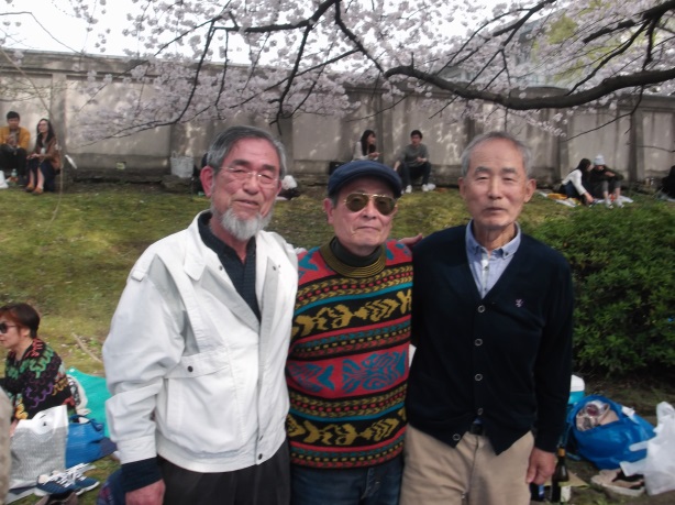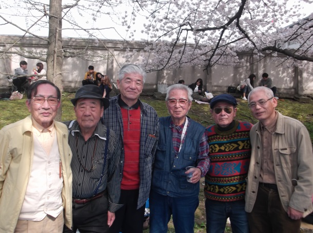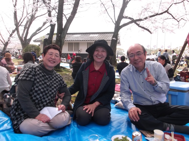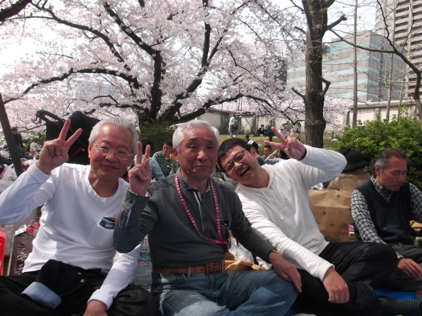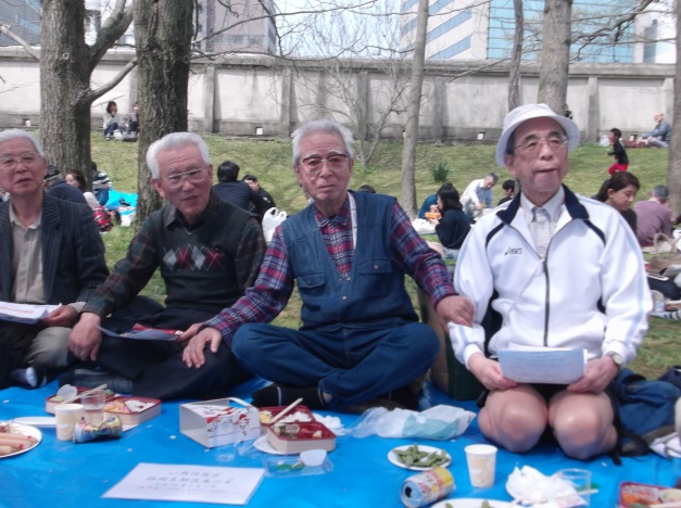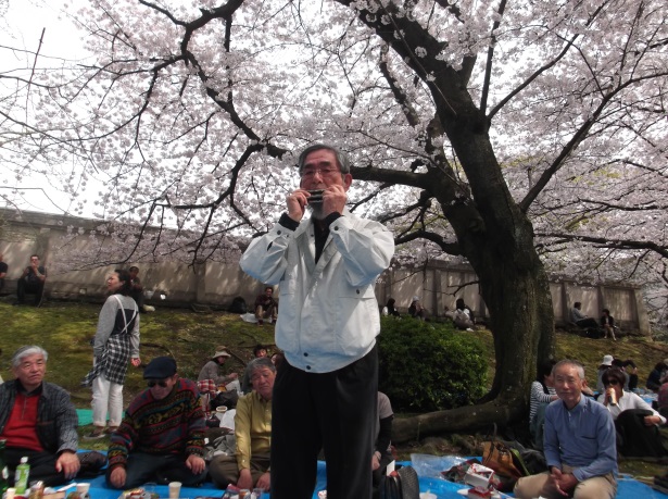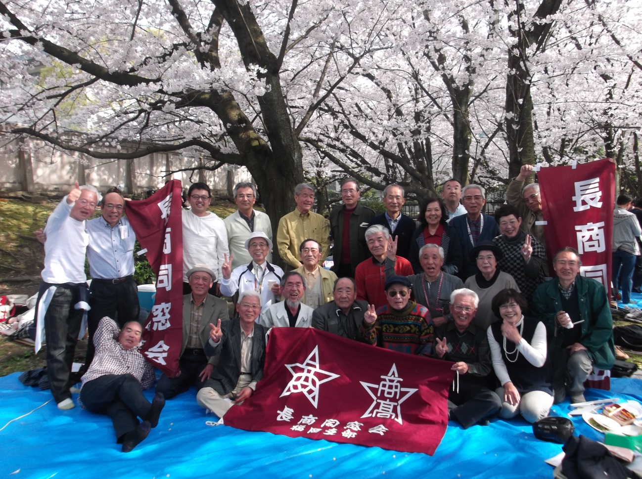 自ずと初対面の方も多く、あちこちでお酒の酌み交わしがあり皆さん早々と酔いが回ってきたようでした。恒例の自己紹介、近況報告にも熱が入り、木村顧問(高13回)のハーモニカ演奏には周りの美女軍団(花見客)からアンコールが掛かるほどでした。前後の天候不順で当日に花見客が集中した模様で例年の倍は人出があり、“長崎商業君見ずや”の精神の下皆で盛り上がりましたが、「長商同窓会福岡支部花見の会」はかなり目立っていたようでした。