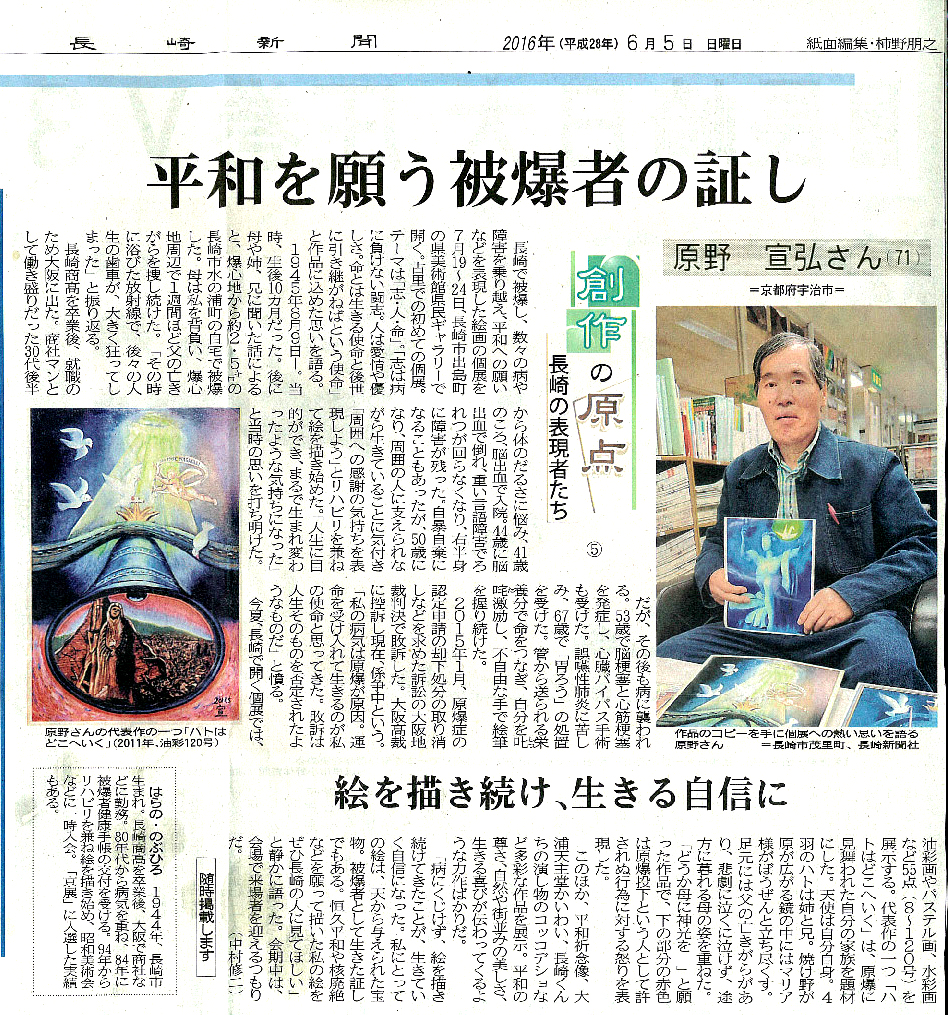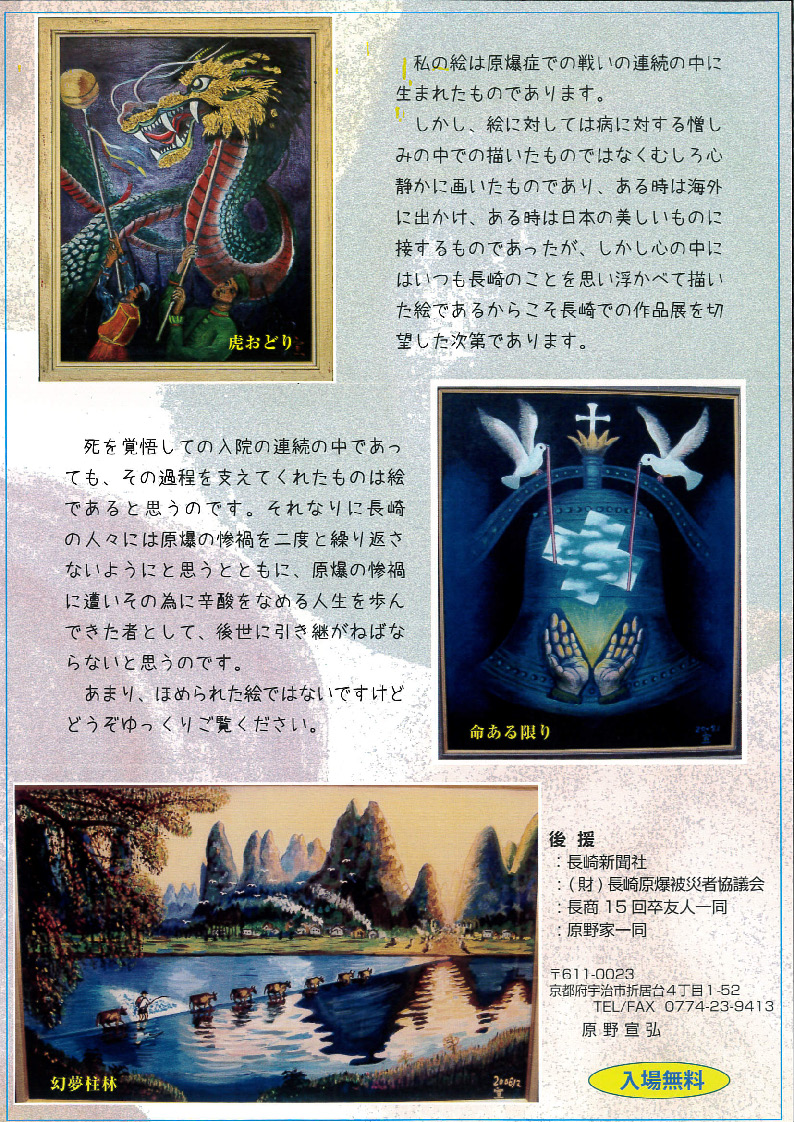 初めまして。私は長崎市在住の被爆者です。この展示会の事は全く知らず、原野正典さん(宣弘さんの長兄では)と言う海星高校の先輩から、7月19日長崎に来られた旨のメールが届き、長崎県立美術館で原野宣弘さんの展示会(7月28日)を知りました。病苦との戦いの中での作品。私の目で見る事が出来ませんでしたが、今後も作品への挑戦を継続して欲しく、メールを送りました。ありがとうございました。